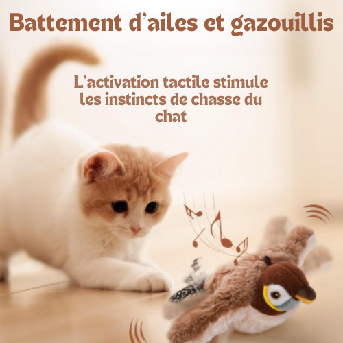 Chippy™ est équipé d’un capteur de toucher automatique qui active des sons de gazouillis et des battements d’ailes chaque fois que votre chat interagit avec lui.