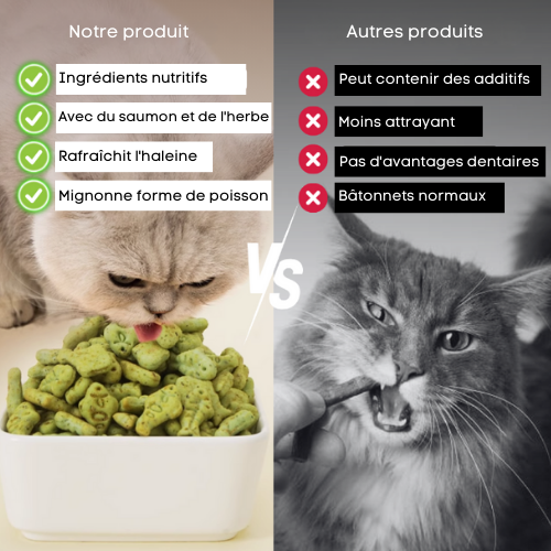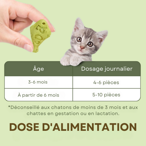 Nous recommandons de donner environ 3 bouchées FishBite par jour, en complément alimentaire ou en friandise. Cette quantité permet de soutenir l’hygiène dentaire, la digestion, et d’apporter un moment de plaisir à votre chat.