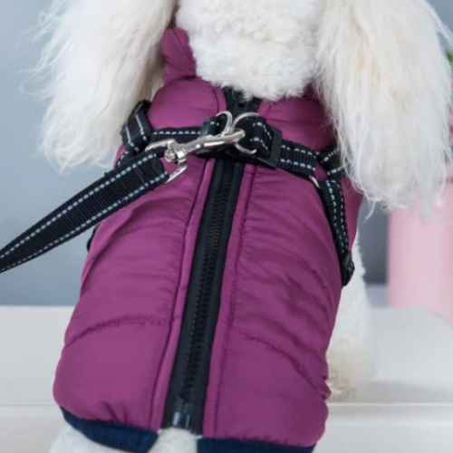 Le FrostPaw™ est un manteau chaud et imperméable qui fait aussi office de harnais réfléchissant.