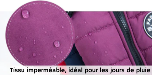 Le manteau est équipé d'une grande fermeture éclair en résine de haute qualité située sur le dos, rendant l'enfilage et le retrait simple, sans risque que votre chien la gratte ou l’abîme.