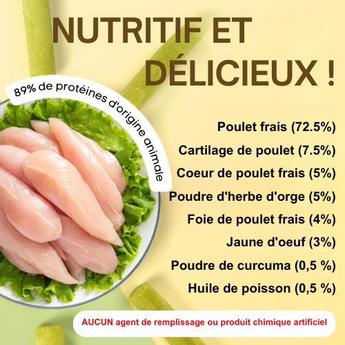 • Cartilage de poulet (7,5%) : Contribue à la santé des articulations et à une bonne mastication.
