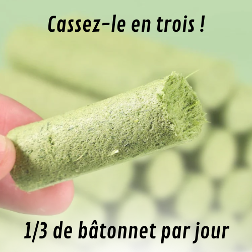 Il est recommandé de donner environ 1/3 de bâtonnet par jour à votre chat. GreenBite™ est un concentré de bienfaits, et une petite portion suffit pour profiter pleinement de ses effets. Vous pouvez facilement casser le bâtonnet en trois morceaux pour ajuster la quantité et prolonger son utilisation.