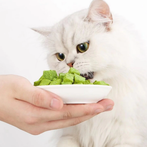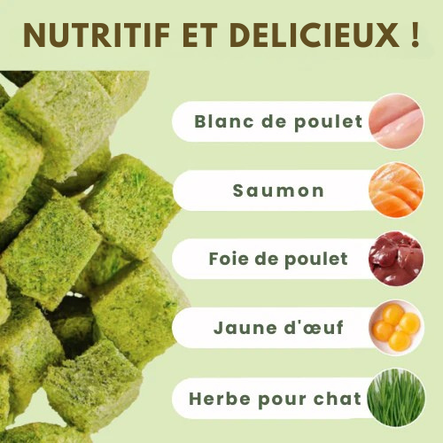 Les friandises lyophilisées ont le vent en poupe, et les bouchés Greenbite™, à base de 90 % de poulet et 5 % d’herbe à chat, est l’alternative naturelle et savoureuse parfaite pour récompenser votre félin… tout en l’aidant à bien digérer !