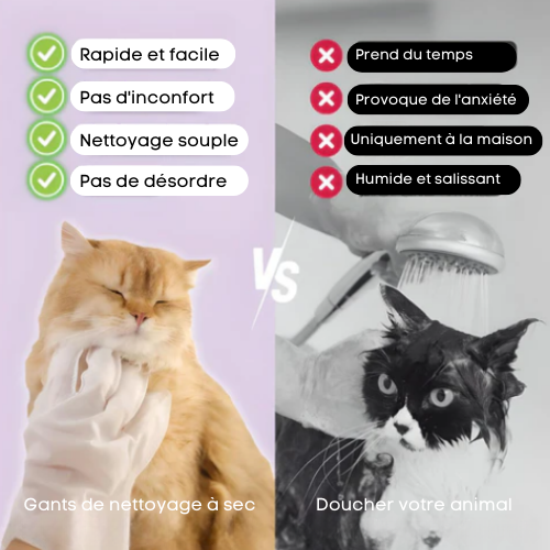 Plus besoin d’eau ni de sèche-cheveux stressants : ces gants pratiques vous permettent de nettoyer votre chat ou chien en moins de 5 minutes, sans effort.